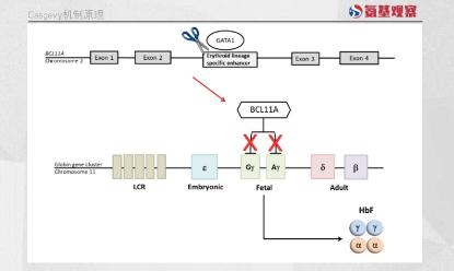 Casgevy做的就是模拟这种突变,让患者造血干细胞的BCL11A进行切割,松开胎儿血红蛋白的刹车。这也使得,Casgevy具有治疗镰状细胞病、输血依赖性β地中海贫血的潜力。