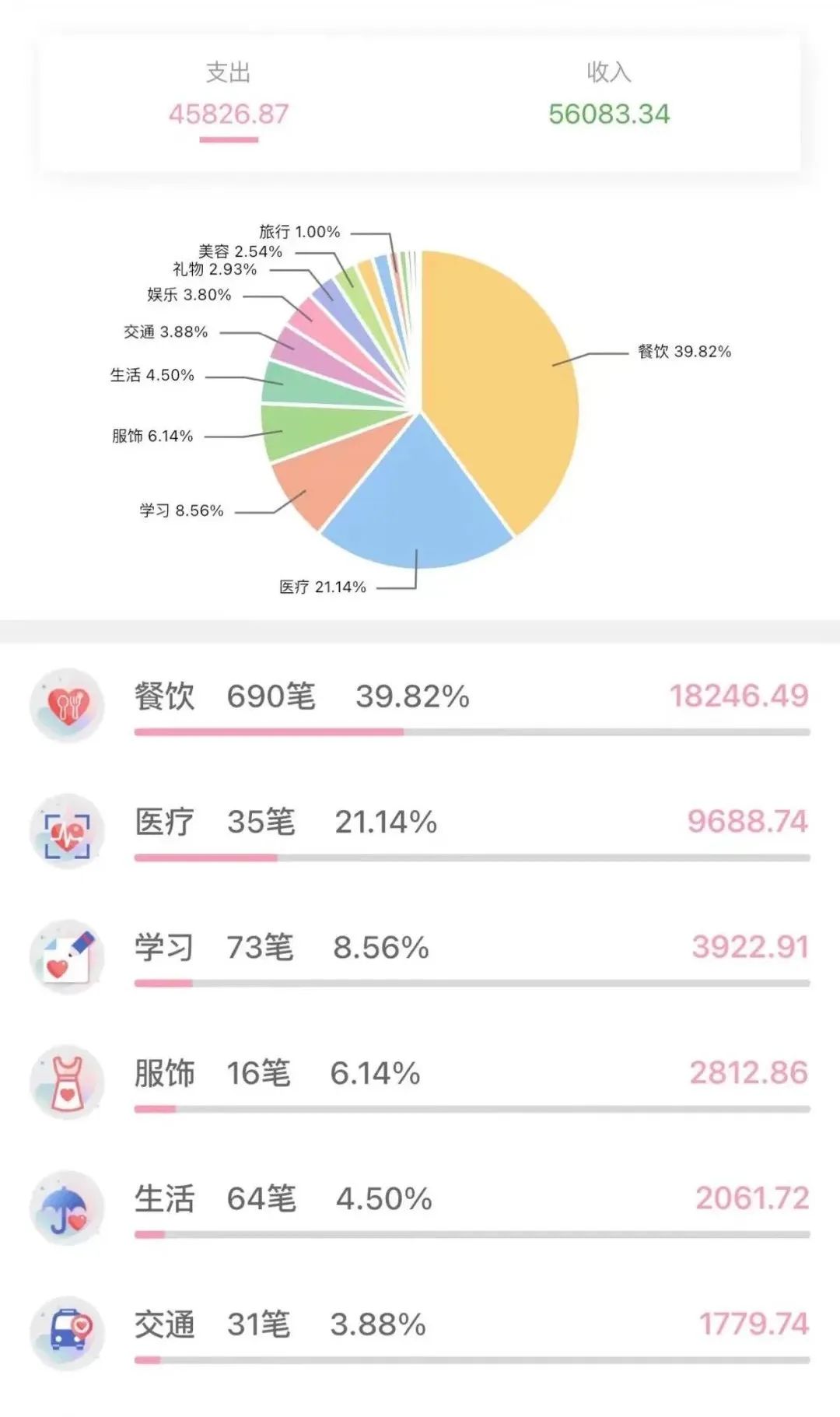 从我记账的记录来看,差不多一个月吃饭会花 1200 左右,其他的钱可能会花在出去玩或者买生活用品、书籍上。我会先把吃饭的钱预留出来,分摊到每一天再计算存多少钱,比如每天大约是 40 块,如果某天我花了 35 块,那这天我就会把剩下的 5 块钱存下来。