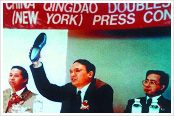 几年后,汪海再次到美国开发布会。有记者看他穿着皮鞋,故意怼他:脚上穿的是双星鞋吗?汪海当即脱下鞋,指着鞋底的双星商标,大声读道: