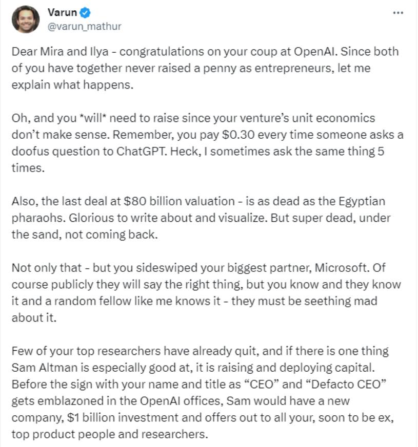阿尔特曼被OpenAI解雇当天,人工智能公司Hyperspace的CEO Varun Mathur在X平台(原推特)上给OpenAI首席技术官和临时CEO Mira Murati以及首席科学家Ilya Sutskever写了一封公开信,信中直接暗讽是米拉·穆拉蒂(Mira Murati)和伊利亚·苏斯克沃(Ilya Sutskever)在OpenAI“政变”中夺权成功,但两位作为创业者却从未为OpenAI筹集过任何资金。