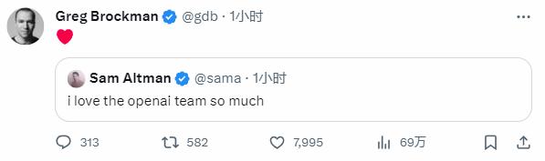 彭博社援引的其中一位知情人士称,阿尔特曼对重返OpenAI持开放态度。The Information报道称,阿尔特曼可能于美西时间周六晚上决定是否回到OpenAI。11月19日中午12:49,阿尔特曼在社交平台称,我非常喜欢OpenAI团队。布罗克曼随后转发点赞。