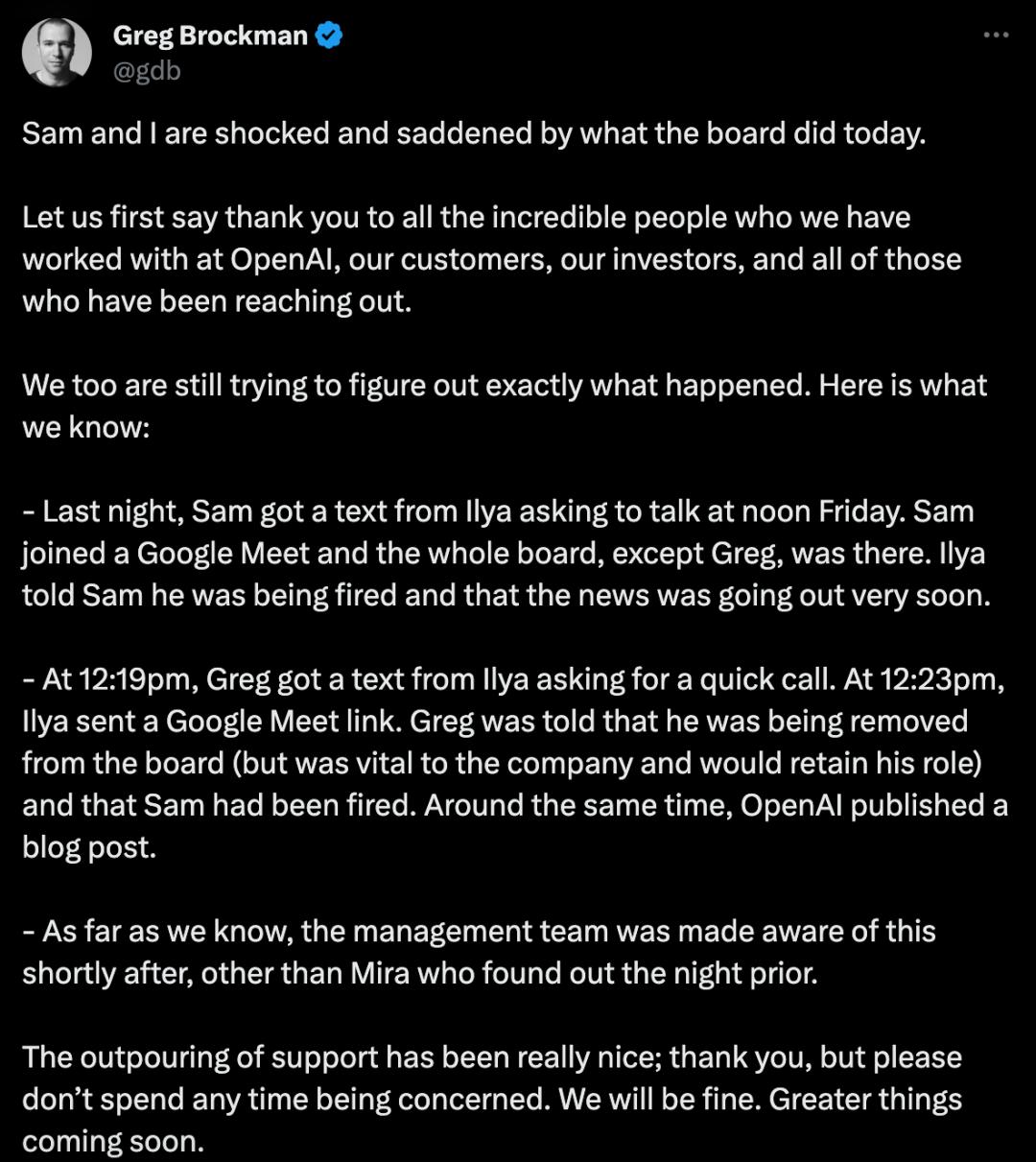 当天晚些时候,Open AI 董事会董事兼总裁 Greg Brockman 发推表示自己已经致辞。随后 Greg 又发推描述了自己被迫出局的大致经过,并在推文描述中表达了对自己和 Altman 经历的震惊。