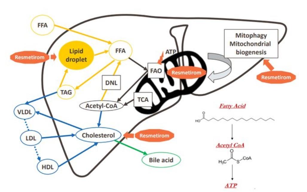 THR-β在肝脏中,能够调节脂代谢,降低低密度脂蛋白胆固醇、甘油三酯和致动脉粥样硬化性脂蛋白,还可以通过促进脂肪酸的分解和刺激线粒体的生物发生来减少脂肪毒性并改善肝功能,进而减少肝脏脂肪。