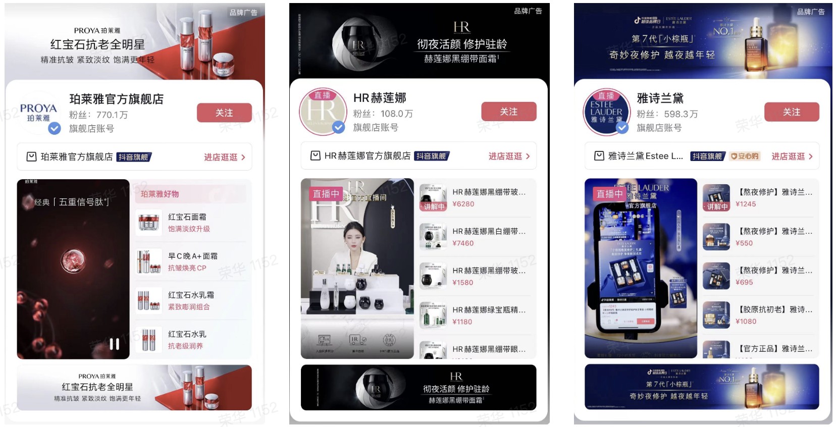 珀莱雅、赫莲娜、雅诗兰黛的搜索结果和货品展示 截图来源:抖音电商