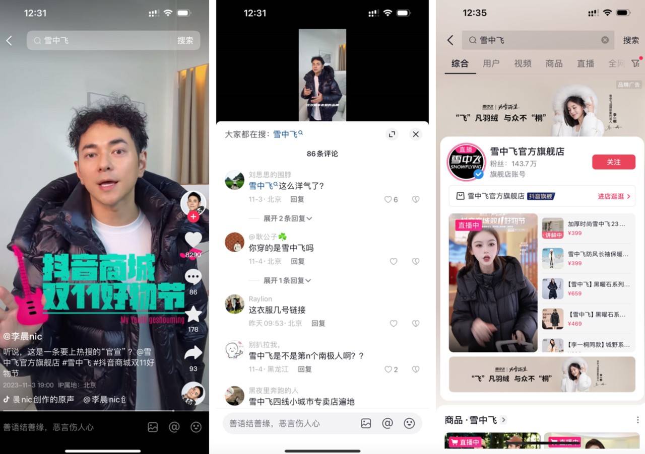 羽绒服品牌“雪中飞”参与到抖音电商双11「节盟计划」的“好内容”合作中,品牌根据自身的核心用户画像,筛选出了“李晨nic”等12个垂类优质达人。优质的内容合作在增强品牌曝光的同时,短视频话题词、置顶链接、搜索吸顶词等设置也顺畅承接了用户的“进一步了解”、“确认下单”的意愿。