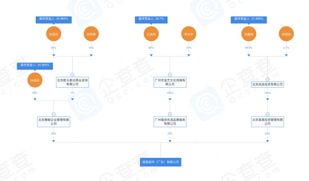国美超市的股东包括北京腾毅企业管理有限公司(持股35%,为实际控股股东)、广州蔻侈优选品牌服务有限公司(持股33%)和北京美昊投资管理有限公司(持股32%)。而北京腾毅和北京美昊都属于国美资本旗下公司,国美系实际占到67%股权。