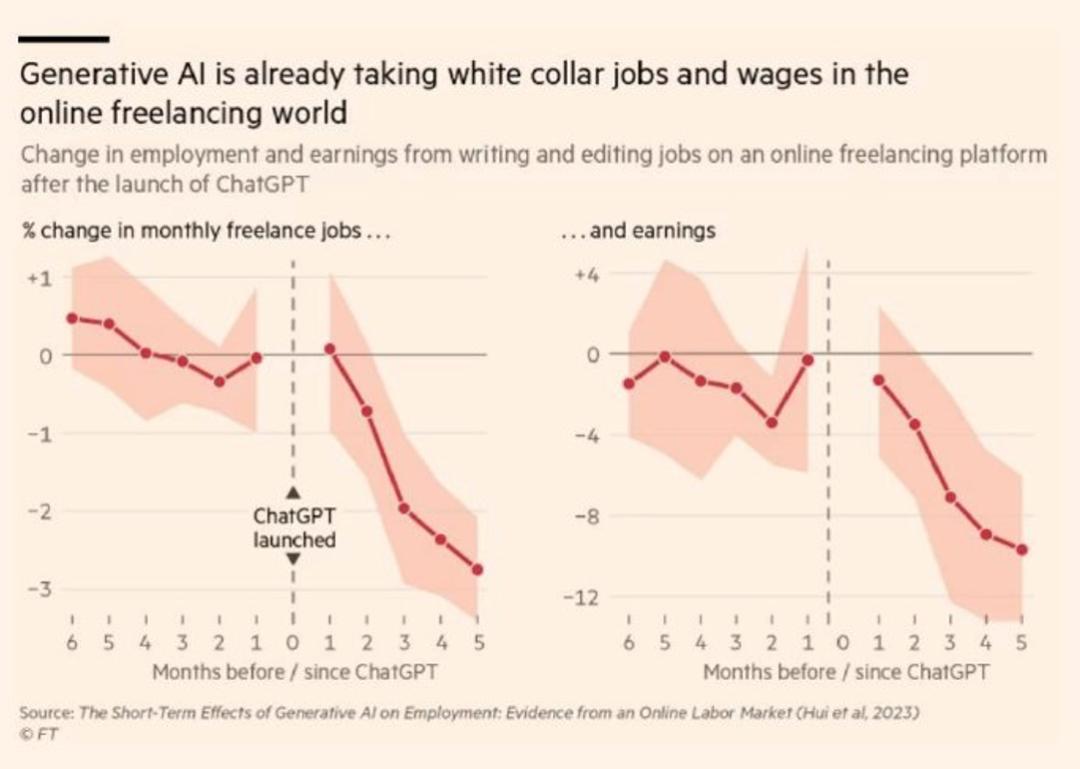 以ChatGPT的发布为分水岭,全球自由职业平台上的写作/编辑类从业者的数量和收入都进入了断崖式下跌的轨道[16]