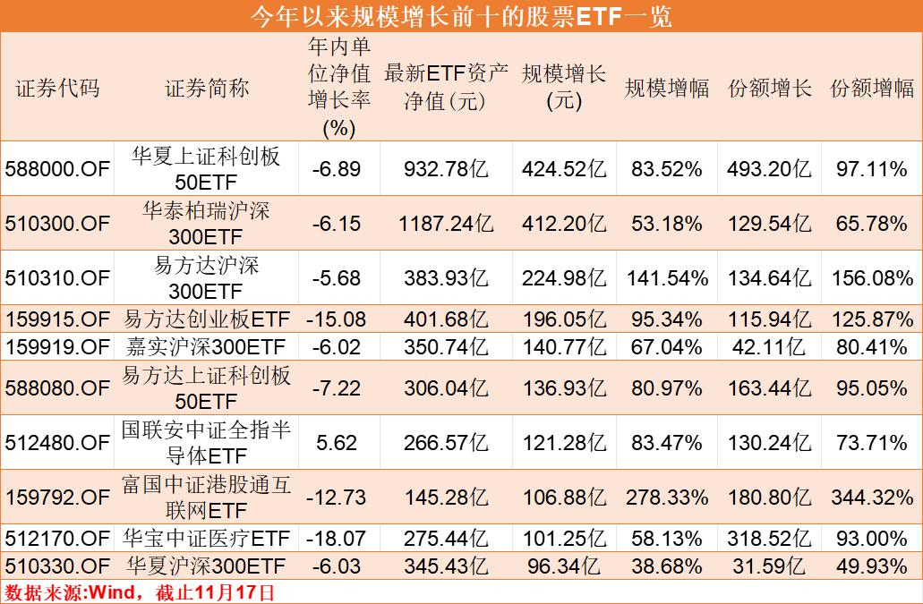 今年以来,宽基ETF成为市场资金加仓的重点,年内规模增长前十的ETF中,有7只是宽基ETF,其中,华夏科创50、华泰柏瑞沪深300两只ETF年内双双“吸金”超过400亿元,华泰柏瑞沪深300ETF规模更是首破千亿,问鼎全市场首只千亿级股票ETF。