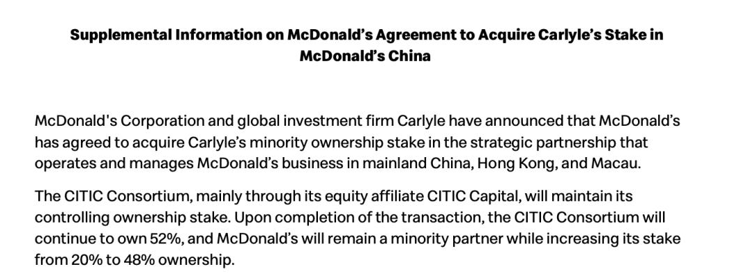 本次交易完成后,麦当劳在金拱门(注:麦当劳在华运营主体的简称)的持股比例将从20%增至48%,以中信资本为主的中信联合体将继续持有52%股份。