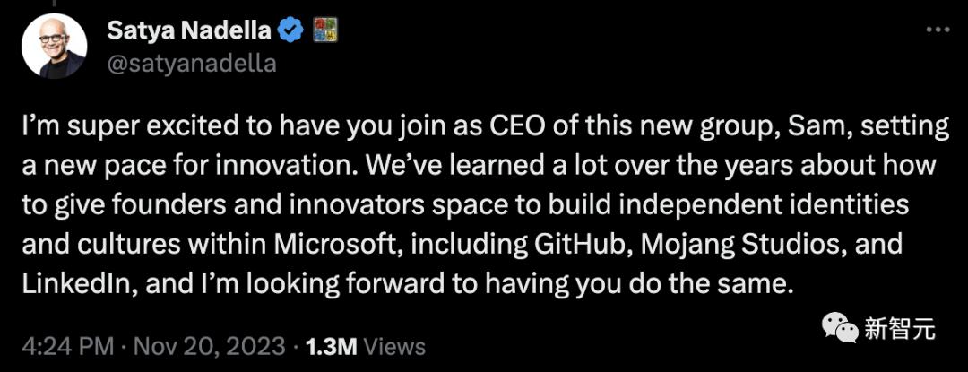 纳德拉紧跟着Altman的回复,明示了微软将会参照对待GitHub,Linkedin等组织一样,「给与创始人和创新者在微软内部足够的空间,去建立独立的身份和文化」。