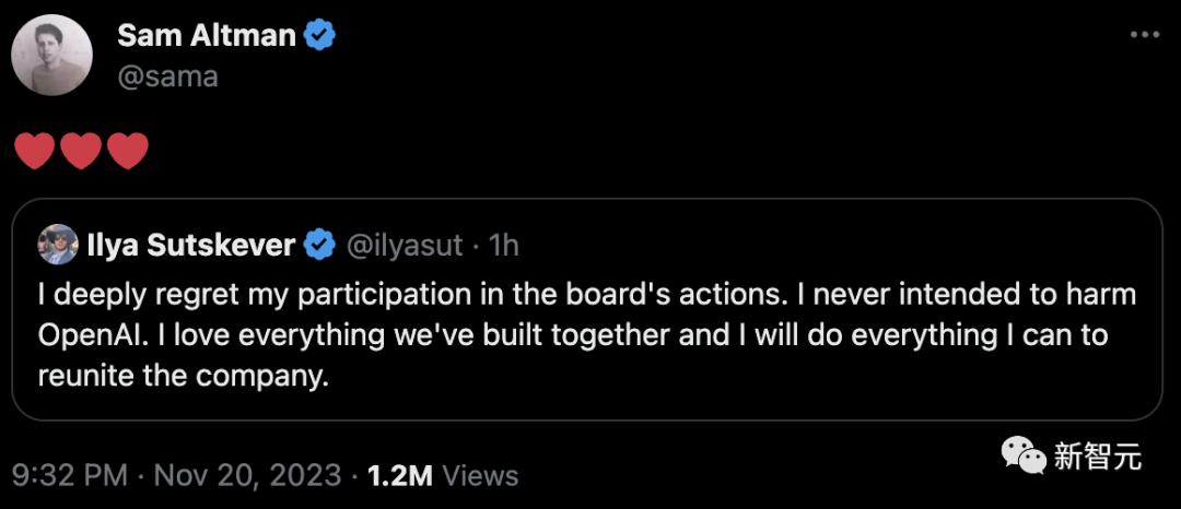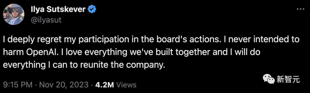当地时间一大早,「始作俑者」的公司首席科学家兼董事会成员Ilya Sutskever发推表示,自己现在很后悔。