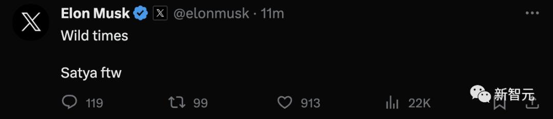 连马斯克也在纳德拉的X下边表示膜拜:「纳德拉你也太会了吧!狂野的时代!」
