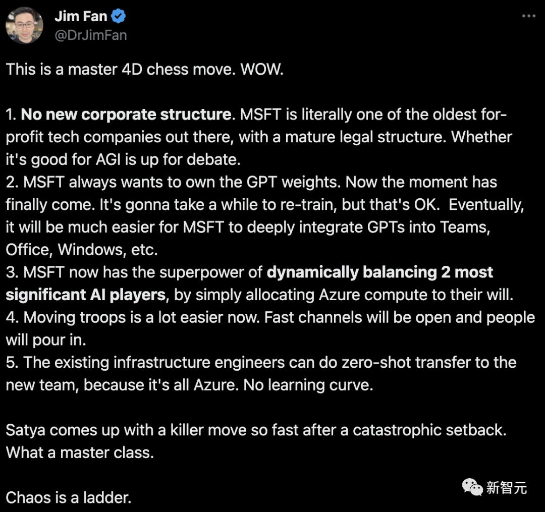 他还进一步分析了微软「招揽Altman」这步棋「一箭四雕」的高明之处,让观众们「明明白白吃瓜」: