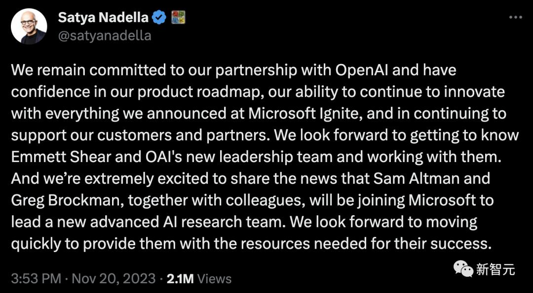 当地时间深夜,微软CEO纳德拉突然官宣:Sam Altman、Greg Brockman将和其他同事一起加入微软,并负责一个全新的AI研究团队。