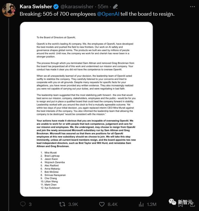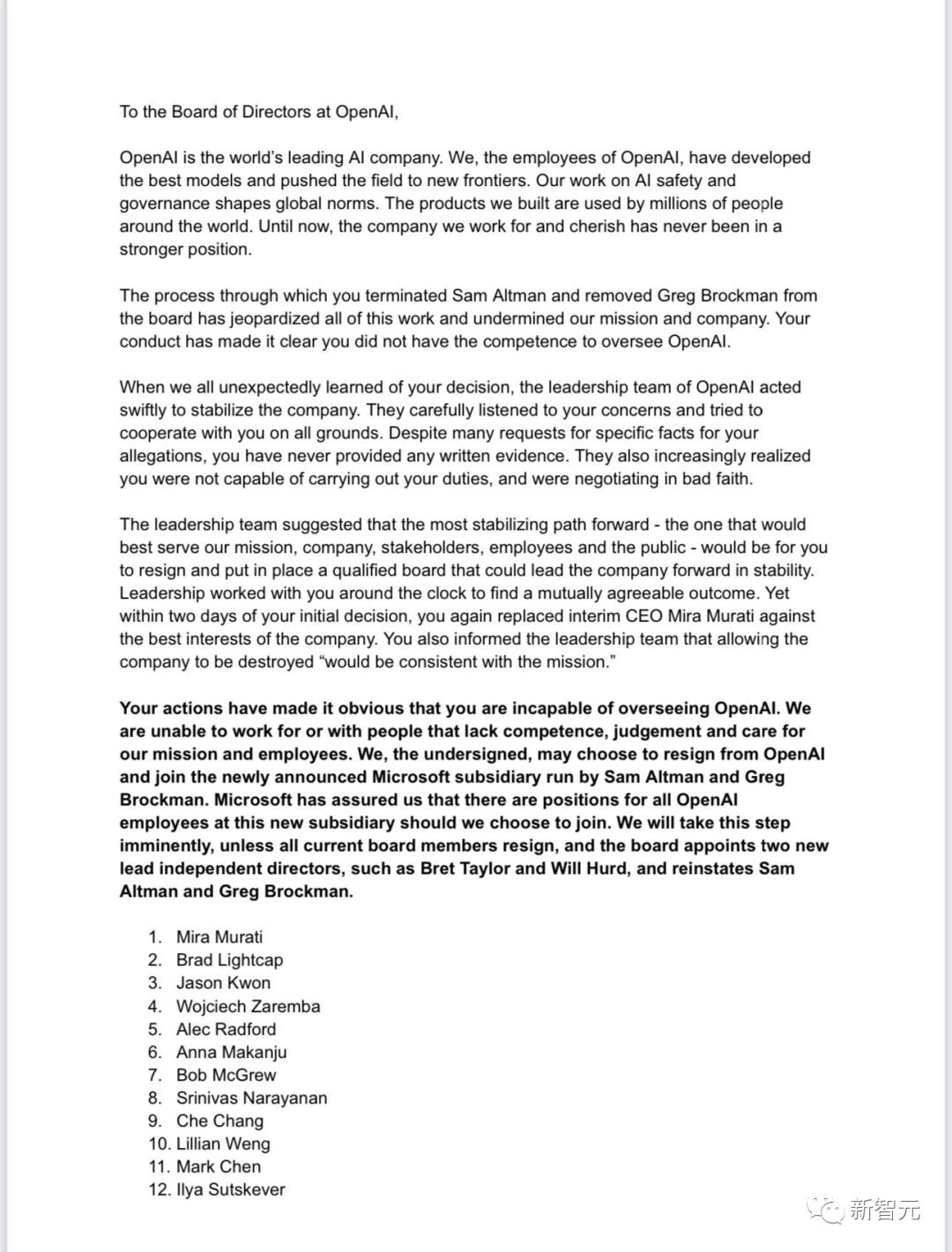 你们的所作所为已经清楚地表明,你们无法有效地管理OpenAI。我们无法与那些缺乏能力、判断力以及对我们使命和员工缺乏关怀的人共事。我们,以下签名者,可能会选择离开OpenAI,加入Sam Altman和Greg Brockman领导的微软子公司。微软已向我们保证,如果决定加入,所有OpenAI的员工都可以在这家新的子公司任职。除非所有现任董事会成员辞职,重新任命两位新的独立领导董事,如Bret Taylor和Will Hurd,并重新任命Sam Altman和Greg Brockman,否则我们将立即采取行动。