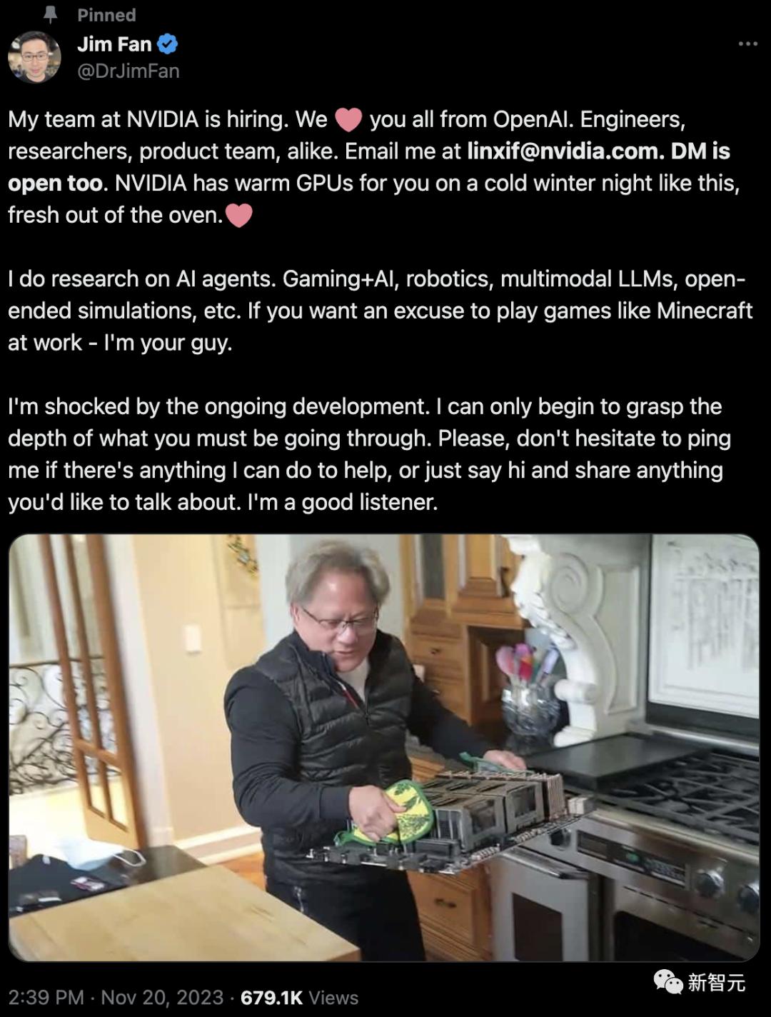 英伟达科学家Jim Fan马上发推招聘,摆出老黄热热腾腾刚出炉的H200,给那些「从OpenAI离开的员工一个新家」。
