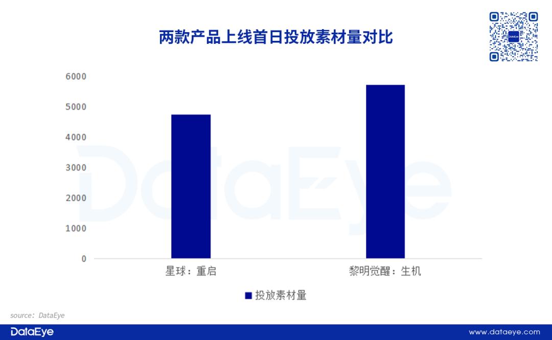 在首日投放量对比中,《星球:重启》与今年上线的《黎明觉醒:生机》投放量相差不大。