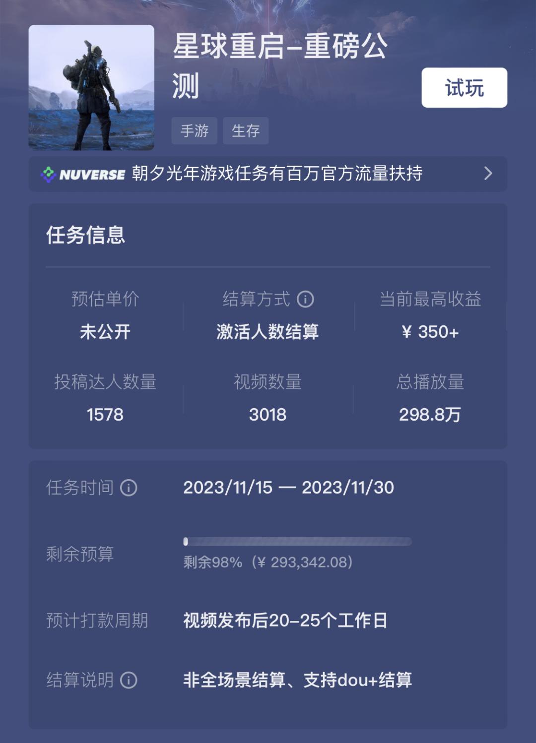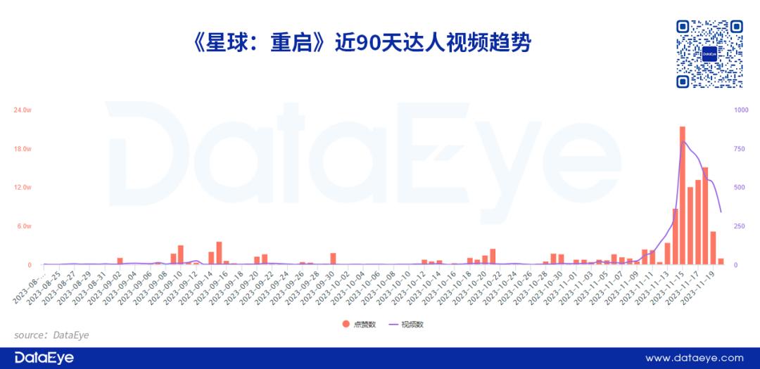 从目前数据来看,《星球:重启》相关游戏发行人计划自15号上线以来,已经吸引超过1500名达人参与内容创作,相关视频数超过3000条,但截至11月20日,总播放量尚未突破300万次。