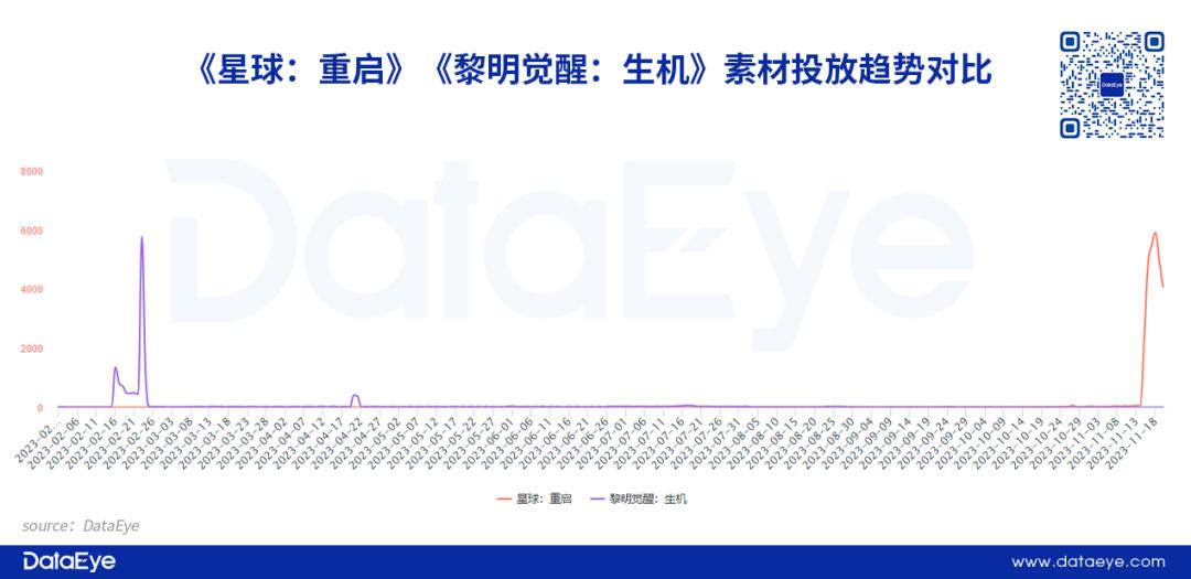 可是从投放趋势来看,《黎明觉醒:生机》上线首日高爆发投放之后,素材投放量快速下降,后续并没有进行买量投放;而《星球:重启》上线以后保持相对稳定的素材投放量。