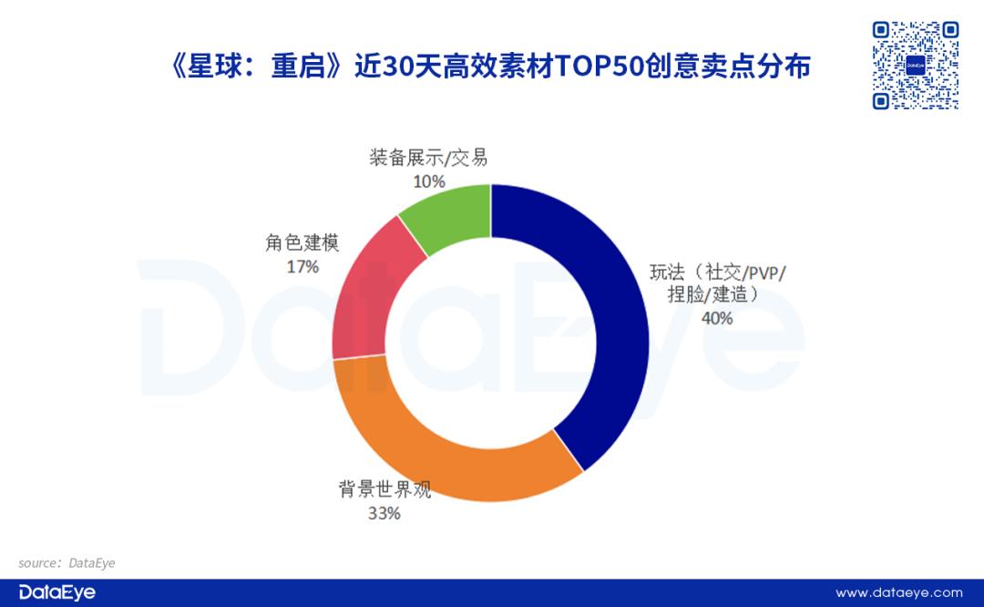 从创意卖点来看:《星球: 重启 》高效素材TOP50创意卖点主要分成四大类: 玩法要素、背景世界观、角色建模以及装备相关。