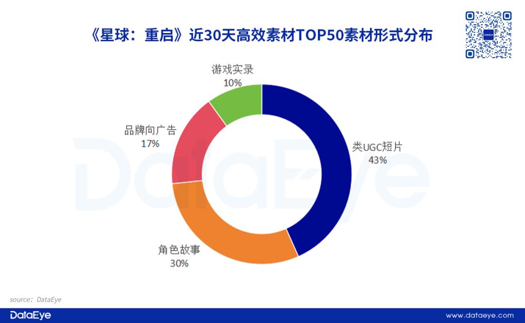 从创意形式来看:《星球:重启》高效素材TOP50的素材创意形式分为4个方向:类UGC短片、角色故事、品牌向广告以及游戏实录。 其中 “类UGC广告”占比最高,而品牌向广告占比17%。