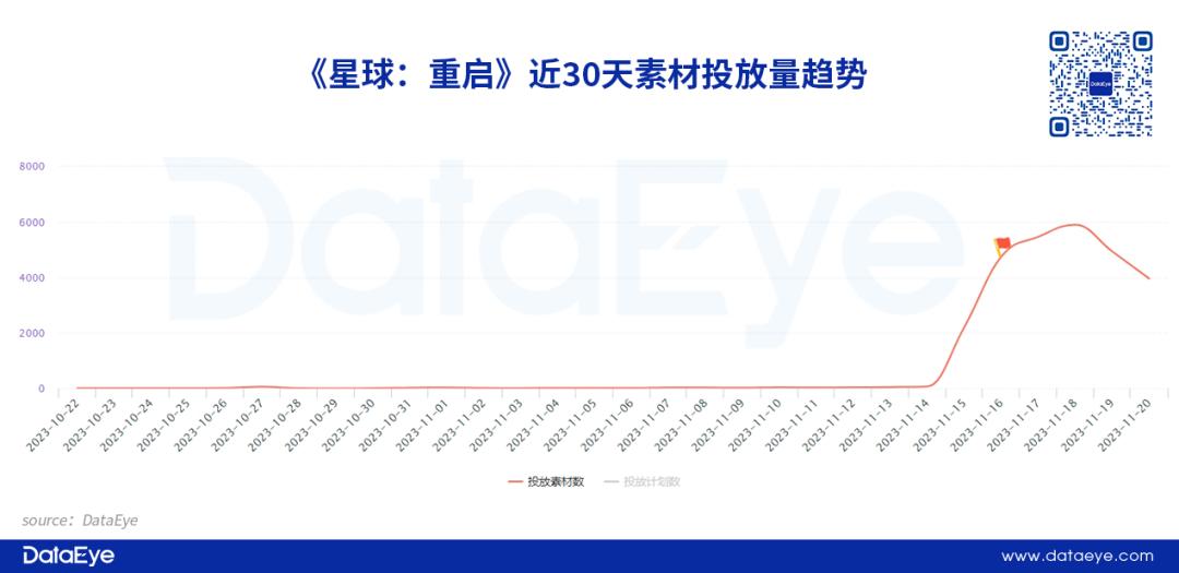 《星球:重启》直到产品上线前一天(11月15日)才开始增加投放素材量。产品上线后,投放素材量持续保持强势。