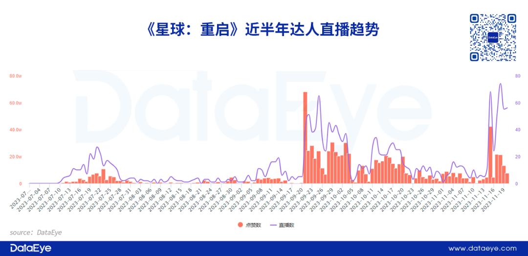 达人直播营销方面 ,《星球: 重启》的相关达人内容集中于在产品 上线前后: 一方面 是采买达人内容集中发布; 另一方面项目组在11月15日上线“抖音游戏发行人计划”。