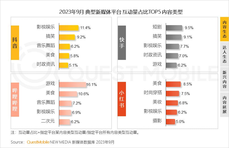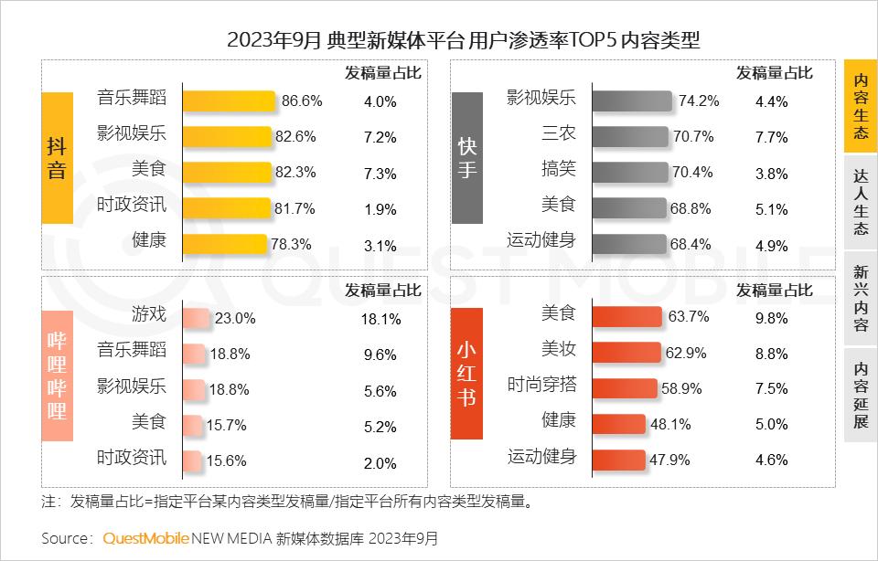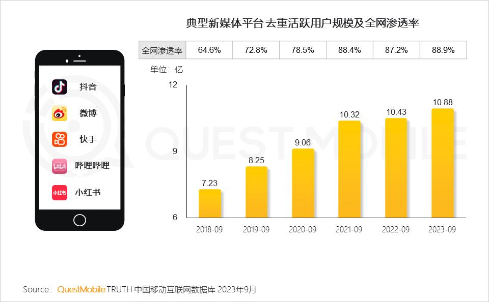 QuestMobile数据显示,2023年9月,五大新媒体平台去重活跃用户规模10.88亿,全网渗透率达88.9%。