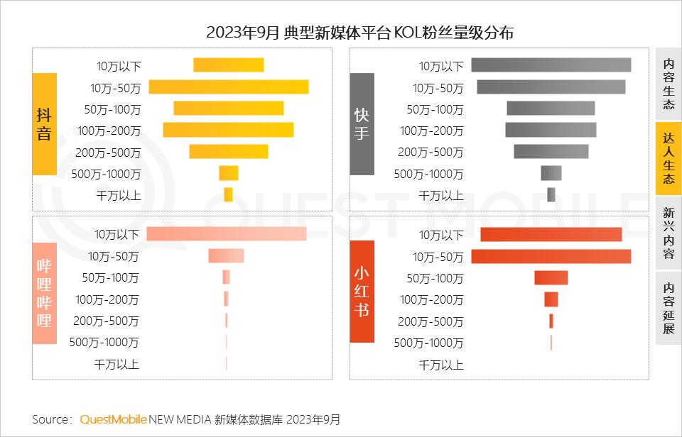 QuestMobile数据显示,哔哩哔哩、小红书仍以50万以下粉丝的达人为主;抖音与快手百万粉丝KOL占比超30%,快手10万以下达人占比高,这与其长期的原创达人扶持政策相关。
