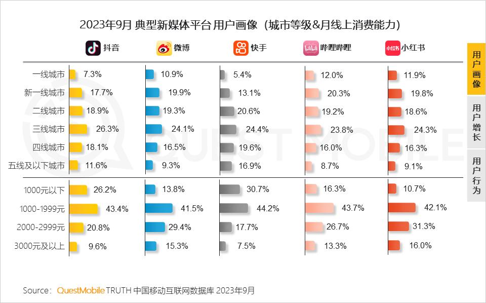 3、微博、哔哩哔哩、小红书在一二线发达城市的强渗透带动高消费人群占比;快手则是三线及以下市场用户聚集地