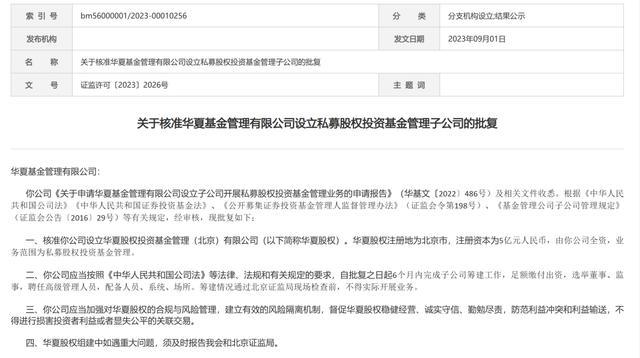 今年9月,证监会发布了关于核准华夏基金管理有限公司设立私募股权投资基金管理子公司的批复。