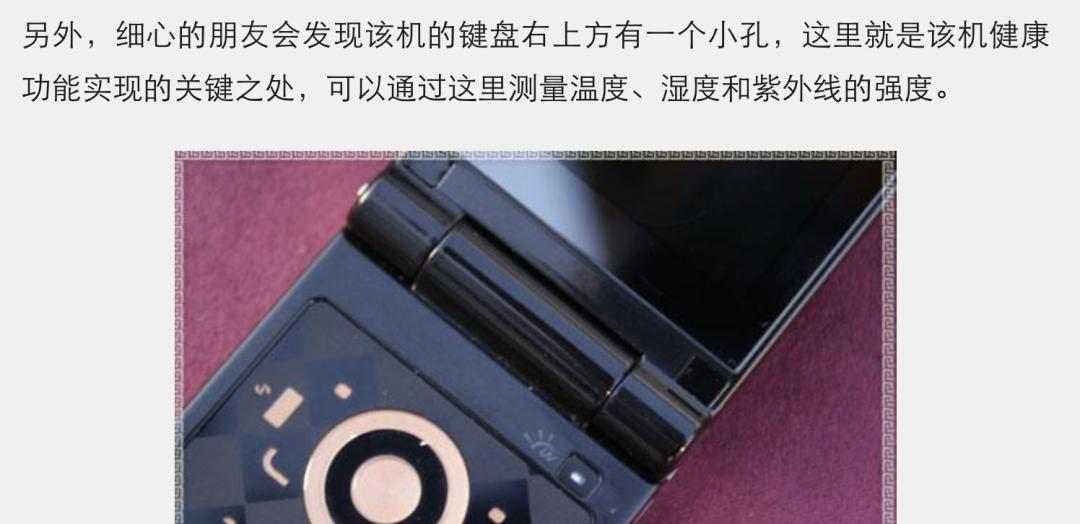当时,这款手机宣称是“美女们最好的私人管家”,不仅能测量湿度、温度、紫外线强度,还能及时提醒“美女”们添衣、补水和防晒。打开手机前盖,键盘的右上方就是温度、湿度和紫外线传感器,手机还能根据数据给出一些穿衣护肤小贴士。这不比现在的一些手机还更“智能”?简直是一个遥遥领先的概念。