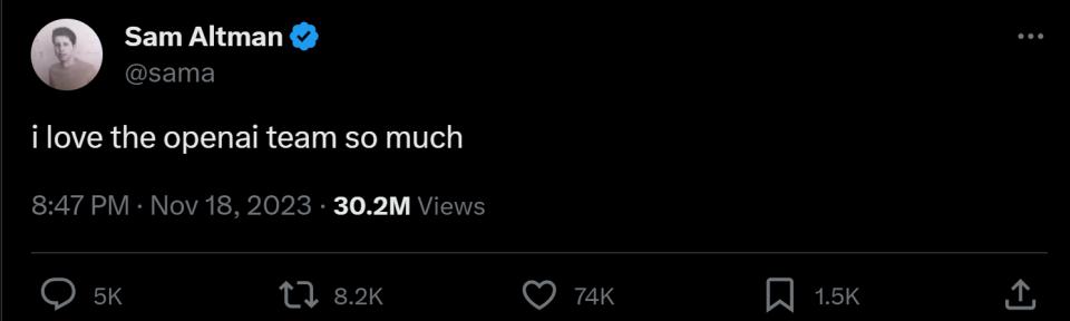 11月18日,有消息传出,微软试图让奥特曼重新回归OpenAI。当日晚间,奥特曼又发布了一条推文,内容是“我太爱Openai团队了”。这条推文引发了大量OpenAI内部员工的转发和点赞,一度在推特上刷屏,被外界视作是表忠心站队的表现。
