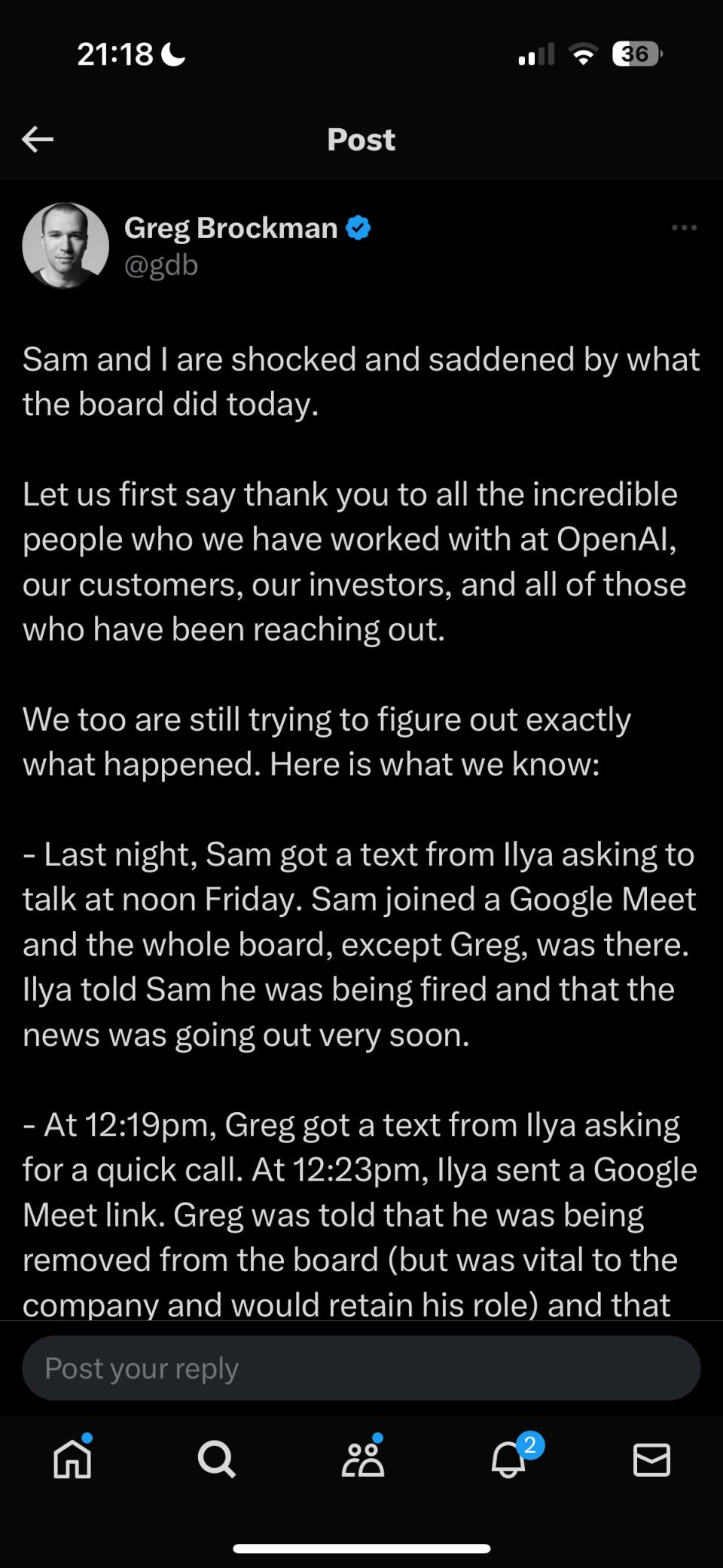 在17日的中午12点19分,布洛克曼收到来自Ilya发来的短信问能否简短通话,12点23分,Ilya发过来一个Google Meet的链接,布洛克曼加入会议后,也被告知他不再拥有董事长职务,但仍保留公司的职位,他同时也被告知,奥特曼已经被解雇。与此同时,OpenAI在官网上以声明的形式发布了这一消息。