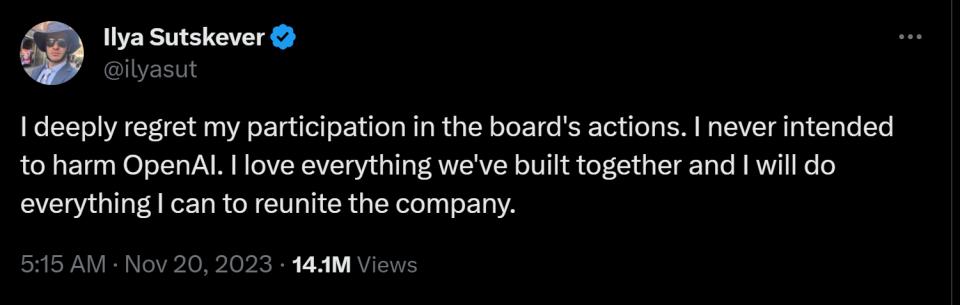 在20日凌晨5点,事件发生后一直没有任何公开发声的IIya Sutskever,终于在其个人推特上发表推文,称自己“非常后悔参与了董事会的行动”,并表示,“从来不想伤害OpenAI,热爱所有一起创造的东西,并且会做我所能做的一切努力让公司重新团结起来”。