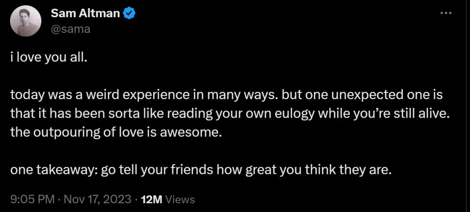 奥特曼的这则推文,并没有说明任何与其被罢免原因相关的内容,但最后的结尾却引人遐想。