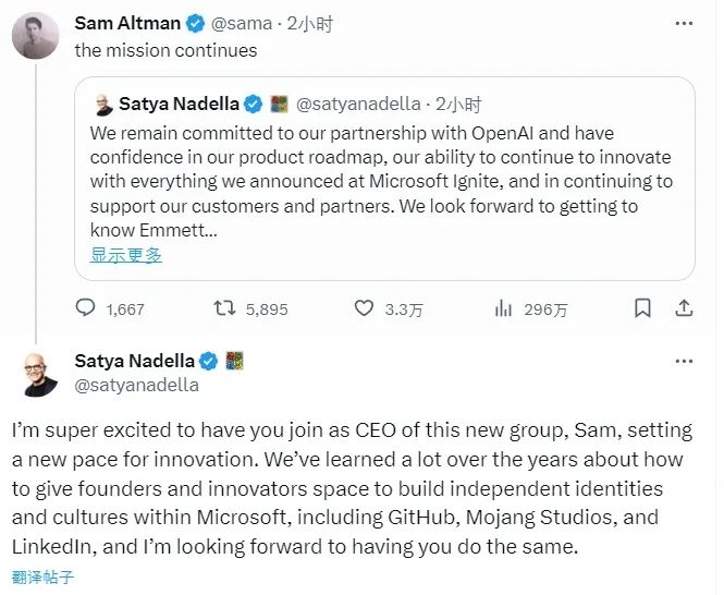 就在这条消息发布不到两个小时,微软董事长兼首席执行官纳德拉直接在X上公布,微软表示将聘任Altman和Brockman领导微软一个新的高级人工智能研究团队,可以说是靠一己之力来为这个动荡不安的周末画上句号。