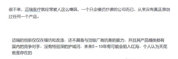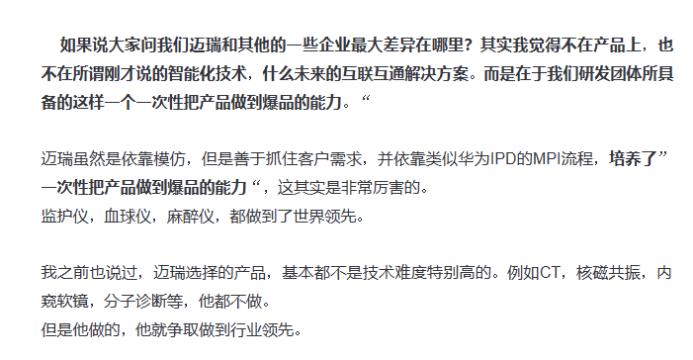 在一篇题为《我从迈瑞离职了,讲几句真心话!》的网文,集纳了几位离职员工在知乎和其他公号上评价“老东家”迈瑞的一些评论: