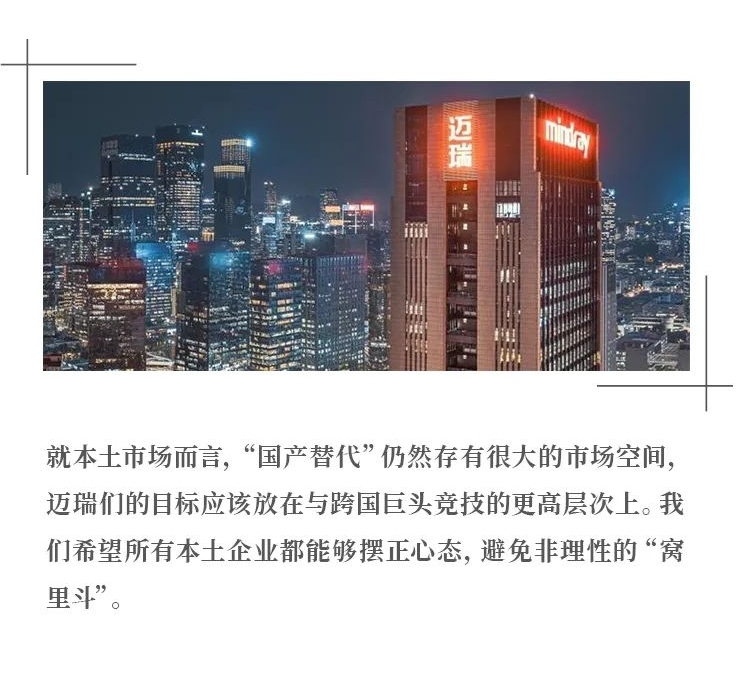所以就本土市场而言,“国产替代”仍然存有很大的市场空间,迈瑞们的目标应该放在与跨国巨头竞技的更高层次上。