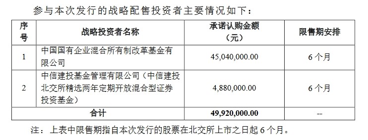 公告显示,2家战投为中国国有企业混合所有制改革基金有限公司、中信建投基金管理有限公司(中信建投北交所精选两年定期开放混合型证券投资基金),分别拟认购4504万元、488万元。