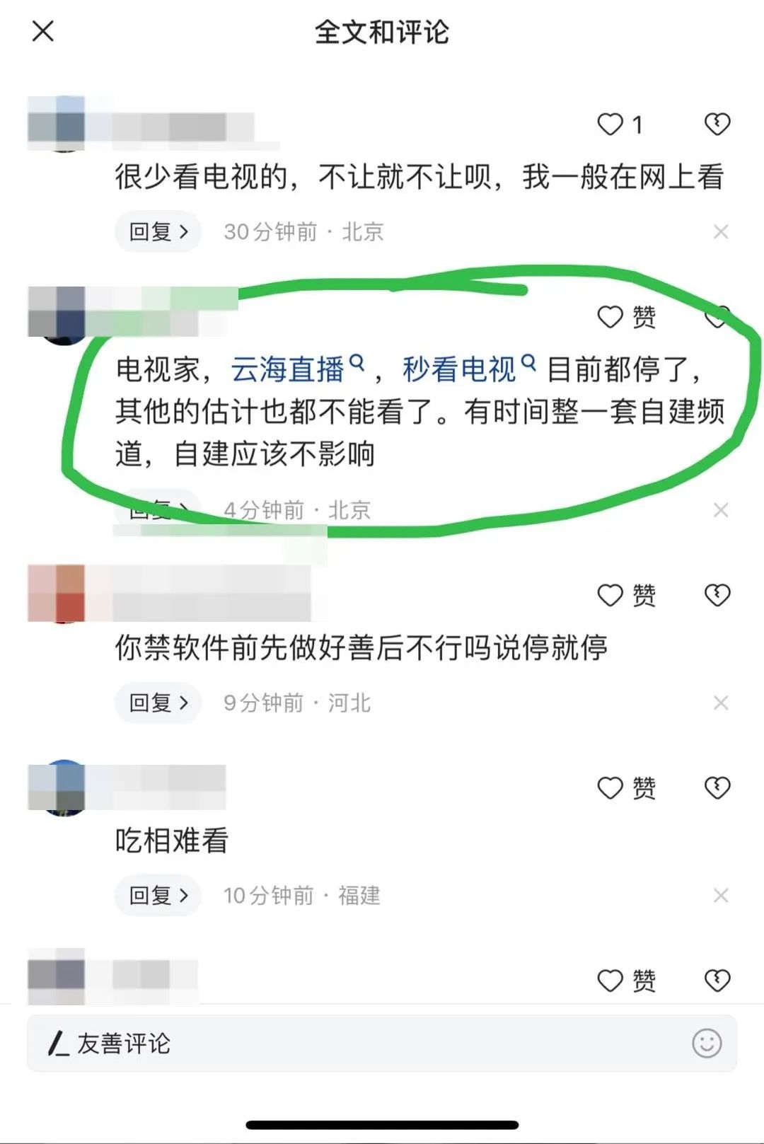 与此同时,也有不少网友反映,不只是电视家,还有云海直播、秒看电视、太阳直播等电视直播App,也都不能用了。