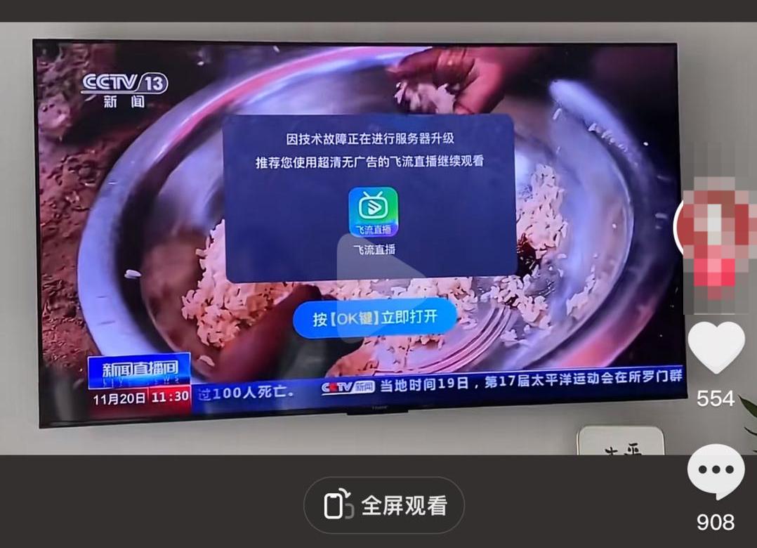 还有网友发布的照片显示,有电视直播App在直播节目时弹出提示:“因技术故障正在进行服务器升级,推荐您使用超清无广告的飞流直播继续观看”。