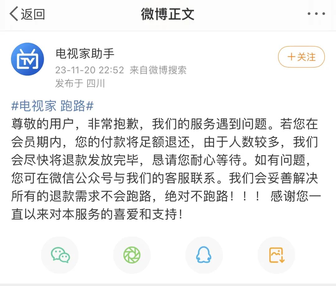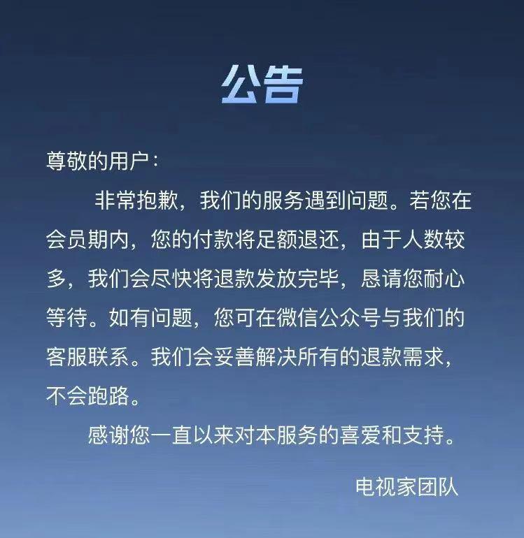昨天,电视家突然发布公告称,其服务遇到问题。若用户在会员期内,用户的付款将足额退还。