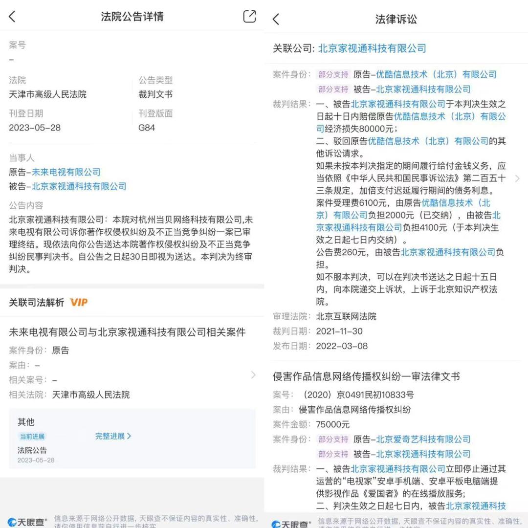 电视家的关联公司还被未来电视有限公司起诉过不正当竞争。 优酷和爱奇艺也都起诉过电视家的关联公司。