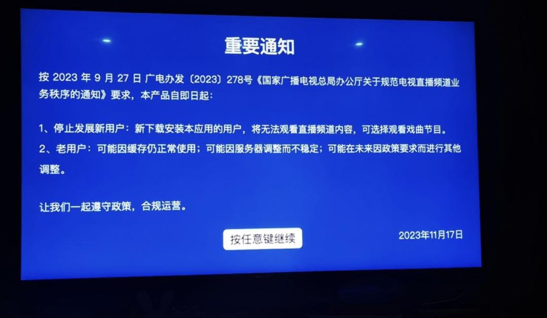 有网友发布的照片显示,有电视直播App发布通知称,按2023年9月27日广电办发 (2023)]278号《国家广播电视总局办公厅关于规范电视直播频道业务秩序的通知》要求,本产品自即日起: