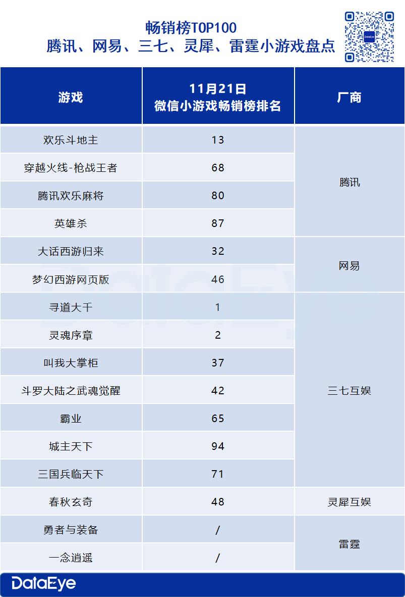 11月开始,三七《灵魂序章》《霸业》等多款小游戏发力。同时,网易《大话西游归来》正式入局微信小游戏,至此“西游IP双王牌”均已入局。