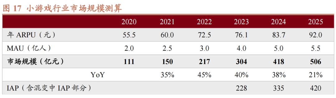 按照招商证券11月6号发布的报告,预计2023年小游戏市场规模超300亿元,同比增长40%,而2021、2022 年小游戏市场规模增速分别为35%、45%。如下表。