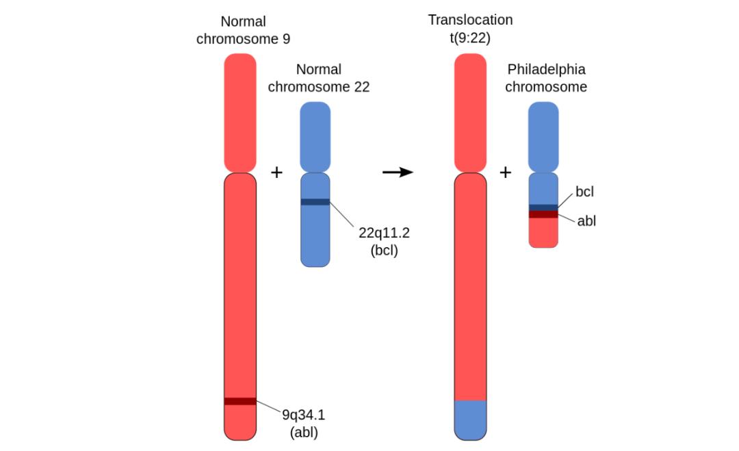 后来经过多年研究,最终证明CML是一种因骨髓细胞染色体缺陷而造成的疾病。由于人体9号染色体上的abl基因易位到22号染色体上,与bcr基因融合形成Bcr-Abl融合基因,又被称为费城(Ph)染色体。