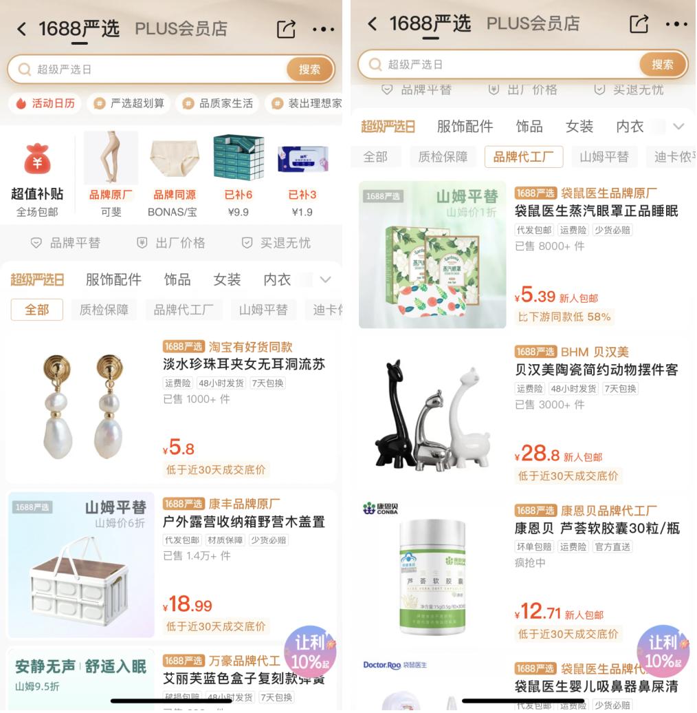 消费者对白牌的认知也在提升,不再将白牌完全等同于假冒伪劣产品,会积极寻找大牌代工厂的平替产品,比如在1688找lululemon同厂,1688去年推出的「1688严选」就主打大牌代工厂;也会购买产地源头产品,比如南通的家纺、织里的童装、义乌的饰品,等等。