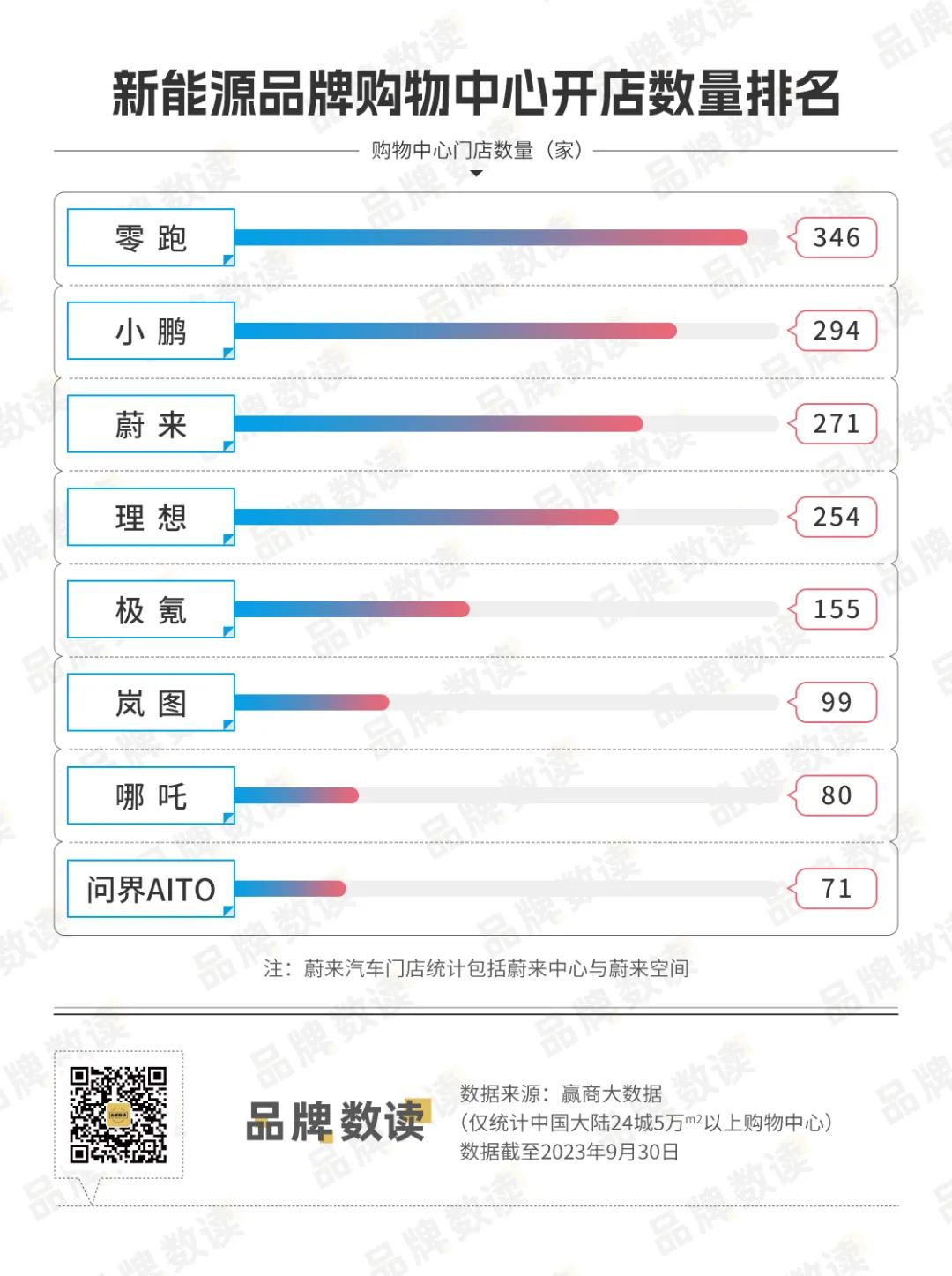 赢商大数据显示,在全国24城5万方以上购物中心中,目前开店最多的新能源汽车品牌是零跑汽车,共开出346家门店。
